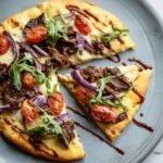 Once baked to perfection, remove the ‘Gourmet Short Rib Pizza with Smoked Gouda Cream’ from the oven. Immediately scatter 1 cup of fresh arugula evenly over the hot pizza; the residual heat will slightly wilt it, bringing out its peppery flavor. Drizzle generously with 2 tablespoons of balsamic glaze over the entire pizza. Adjust the amount of balsamic glaze to your preference, as it adds a lovely sweet and tangy counterpoint to the rich short ribs and creamy cheeses. Slice the pizza into wedges and serve it hot, allowing everyone to savor the incredible blend of tender beef, smoky cheese, and fresh toppings.