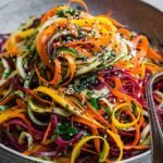For the perfect Healthy 10-Minute Rainbow Veggie Noodle Salad, always shave your vegetables first. This ensures they’re ready for their dressing bath. Whisk the dressing components thoroughly, then pour it over the vibrant ribbons. Gently toss to coat every strand, ensuring a harmonious blend of flavors before garnishing.