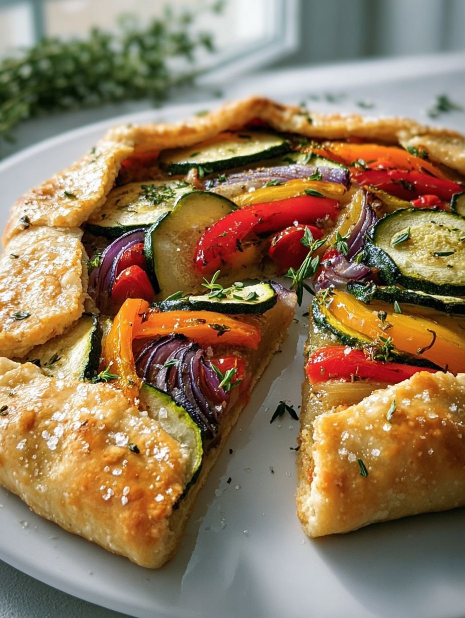 A rustic Mediterranean vegetable galette featuring a golden, flaky pastry crust embracing a vibrant medley of tender, oven-roasted vegetables. Slices of zucchini, colorful bell peppers, and red onion are seasoned with aromatic herbs and olive oil, creating a savory and fresh flavor profile. The edges of the pastry are folded casually over the filling, offering a delightful contrast in texture.