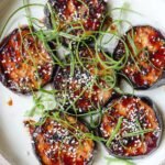 Infuse this glazed eggplant with your flair. Choose Japanese or globe eggplant. For the glaze, use soy sauce or tamari, adjusting optional sugar. Garnish with only white or black sesame seeds. Prepare green onions thinly sliced or julienned for varying texture and appearance.