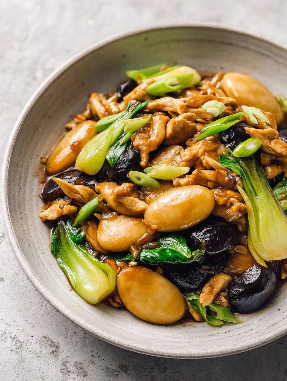 This dish presents a comforting stir-fry featuring tender, chewy oval rice cakes alongside succulent slices of chicken, earthy shiitake mushrooms, and crisp baby bok choy. Each component is coated in a rich, savory brown sauce, delivering a harmonious blend of textures and umami flavors. The quick stir-frying method ensures a vibrant and satisfying meal.