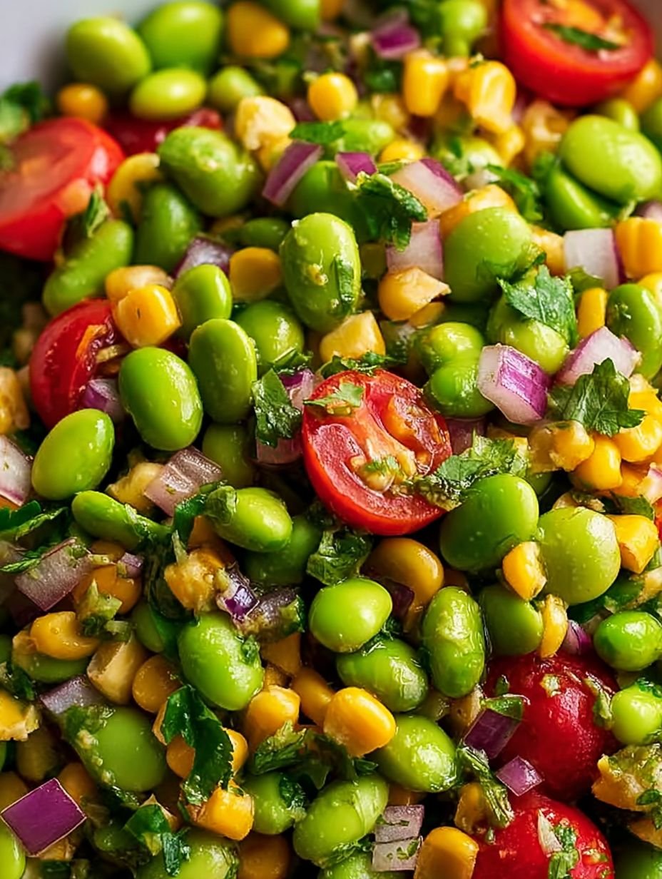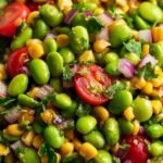 This vibrant edamame salad offers a delightful combination of fresh flavors and varied textures. Tender edamame and sweet corn kernels are tossed with juicy cherry tomatoes, crisp red onion, and fragrant fresh cilantro. A bright and zesty lime dressing brings all the elements together, creating a refreshing and satisfying dish that is perfect as a side or a light meal.