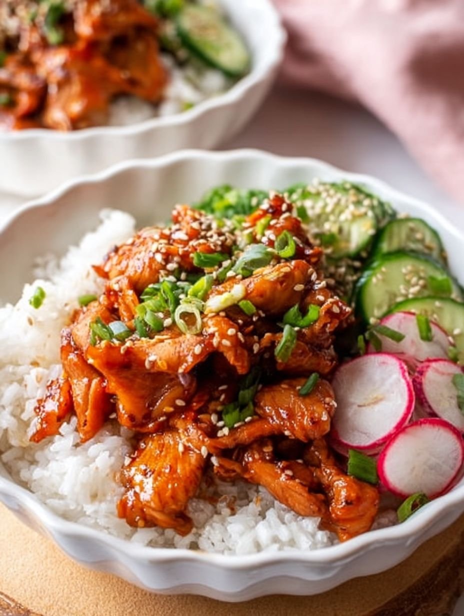 Arrange the thinly sliced English cucumbers and radishes artfully alongside the chicken in each bowl. Garnish each Quick & Healthy Chicken Bulgogi Rice Bowl with chopped green onions and toasted sesame seeds before serving immediately to enjoy the best flavors and textures.