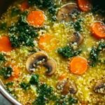 This wholesome soup features fluffy quinoa suspended in a savory, golden broth, brimming with tender carrots, earthy mushrooms, and vibrant kale. Each spoonful offers a harmonious blend of textures and garden-fresh flavors, simmered gently on the stovetop to create a comforting and nourishing meal.