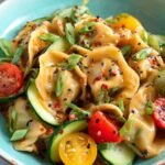 Now for the exciting part: in a large mixing bowl, gently combine the slightly cooled, cooked potstickers, the crisp sliced English cucumber, the vibrant halved cherry tomatoes, and the majority of your thinly sliced green onions. Carefully pour the freshly whisked, luscious sesame-peanut dressing over these ingredients. With a gentle touch, toss everything together thoroughly, ensuring that each potsticker and every piece of vegetable is perfectly and evenly coated in the rich, flavorful dressing, promising a burst of taste in every bite.