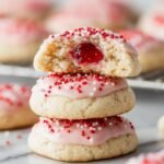 These delightful almond cherry cookies feature a tender, buttery cookie base infused with a subtle almond essence. Each cookie is generously filled with a sweet, vibrant cherry preserve that offers a pleasant contrast in flavor and texture. A smooth, delicate pink glaze and festive sprinkles complete these inviting treats, baked to a perfect golden hue.