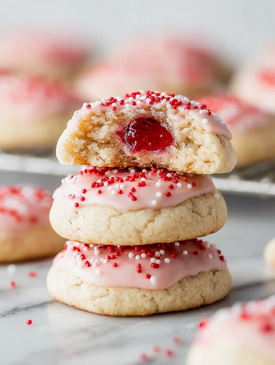 Imagine biting into a tender, buttery cookie, bursting with sweet cherry preserve, all finished with a delicate pink glaze. Pure bliss in every golden-hued bite.