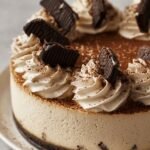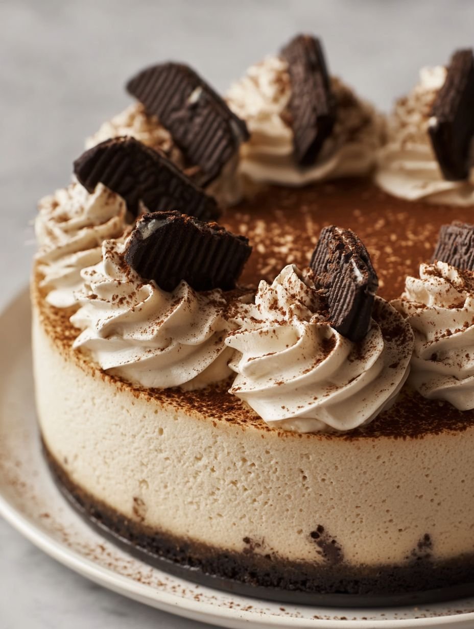 This Tiramisu Cold Brew Coffee Cheesecake offers a delightful fusion of classic Italian dessert flavors with a creamy, no-bake cheesecake texture. A rich chocolate cookie crust forms the base, supporting a smooth, velvety filling infused with the deep, mellow notes of cold brew coffee. The cheesecake is elegantly finished with swirls of light whipped cream, a dusting of cocoa powder, and delicate chocolate pieces, creating a sophisticated balance of coffee, chocolate, and cream in every bite.