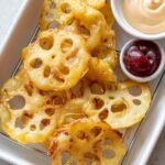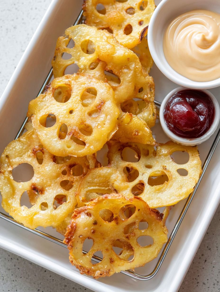 6. **Drain and Serve:** Remove the fried lotus root with a slotted spoon and transfer them to a wire rack set over a baking sheet to drain excess oil. Season lightly with a pinch of salt if desired. Serve immediately with ketchup and spicy mayonnaise.