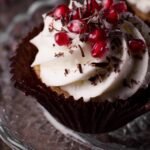 9. **Frost and Garnish:** Once the cupcakes are completely cool, pipe or spread the vanilla frosting onto each cupcake. Garnish immediately with fresh pomegranate arils and dark chocolate shavings.